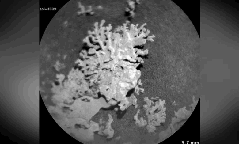 NASA在8月4日發表的聲明中說,這塊淺色岩石直徑約1英寸(2.5厘米),由「好奇號」於7月24日在火星蓋爾隕石坑(Gale Crater)內發現,外形與地球海洋中的造礁珊瑚驚人相似。畫面中,分枝狀結構纖細精巧,與地球珊瑚幾乎無異。
