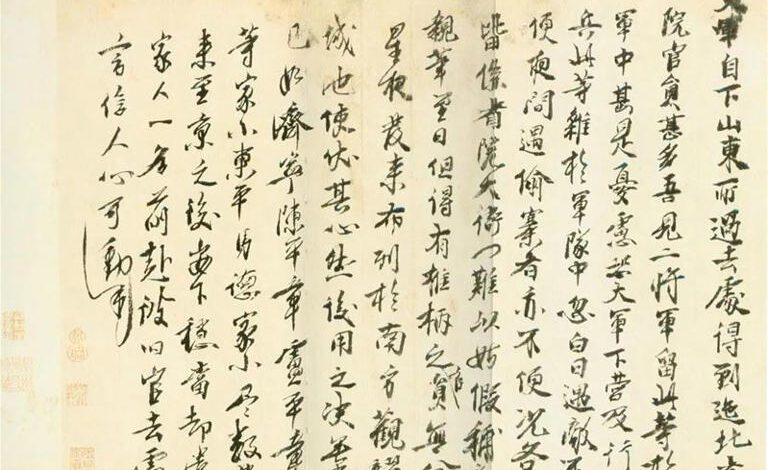 例如,現藏於故宮博物院的《總兵帖》,筆勢奔放,行氣貫通,被認為是其成熟時期的代表作。學者們認為,這幅字是在他對天下大局胸有成竹、權力達到巔峰時所書,因此筆鋒中流露出無與倫比的自信與霸氣。這與他早年顛沛流離、後半生對官員猜忌多疑的性格形成鮮明對比。