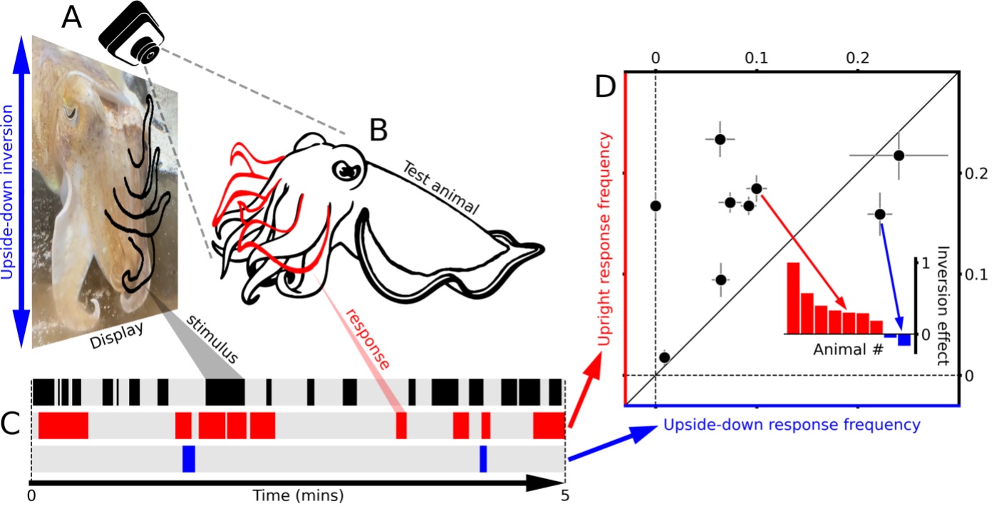 圖片展示了科學家如何測試烏賊(Sepia officinalis)是否能「看懂」其他烏賊的揮手手勢。研究人員播放影片給烏賊觀看(A),影片中是另一隻烏賊在做出特定的揮動手勢(如紅色標記)。當畫面是正的時候,測試中的烏賊會模仿揮手(B、C紅色區段),但當影片上下顛倒播放時,烏賊的反應次數明顯減少(C 藍色區段)。右圖(D)顯示多隻烏賊的統計結果,大部分在觀看正立畫面時的反應頻率較高,暗示這些揮手可能真的是一種視覺訊號溝通。圖/ bioRxiv