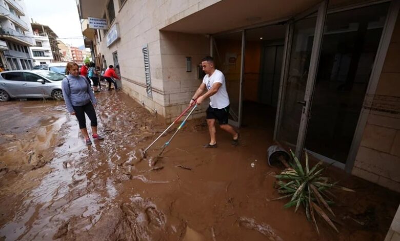 西班牙多地突遭暴雨引發洪災,一名男子13日清理家中的泥土。(路透)
