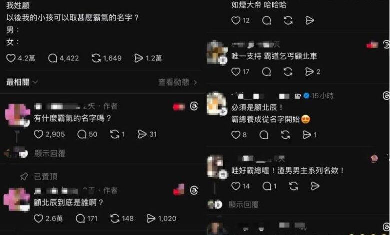 留言區眾網友被笑翻,「我點進這個留言區就是為了看顧北辰(滿意)」、「留言一堆顧北辰笑死」、「那就真的叫顧北辰吧,長大會成為霸道總裁的」、「必須是顧北辰了」、「講到這個姓大概99%都會回答:顧北辰,因為這是告知,不是商量」、「想當霸總當然首選顧北辰」、「準備進來回顧北辰,結果一整排都是」。