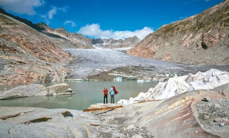 2名遊客9月觀賞瑞士羅納冰河融化形成的湖泊。研究指出,受到氣候變遷影響,瑞士的冰河過去10年就損失了4分之1,今年瑞士冰河融化情況同樣非常嚴重。法新社